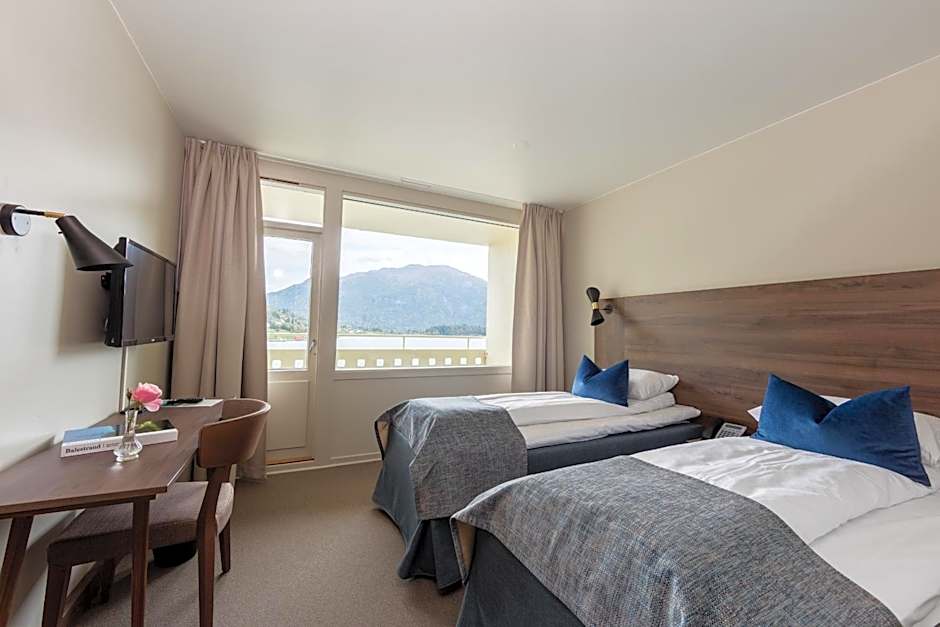 Includes a work desk, seating area and cable TV. Most rooms have a balcony. These rooms are located on floor 5-8 in the modern building, and offer views of the fjord and village.