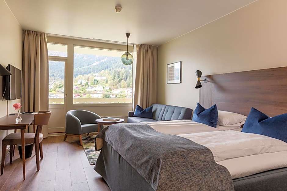 Includes a work desk, seating area and cable TV. Most rooms have a balcony. These rooms are located on floor 5-8 in the modern building, and offer views of the fjord and village.